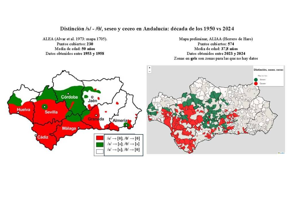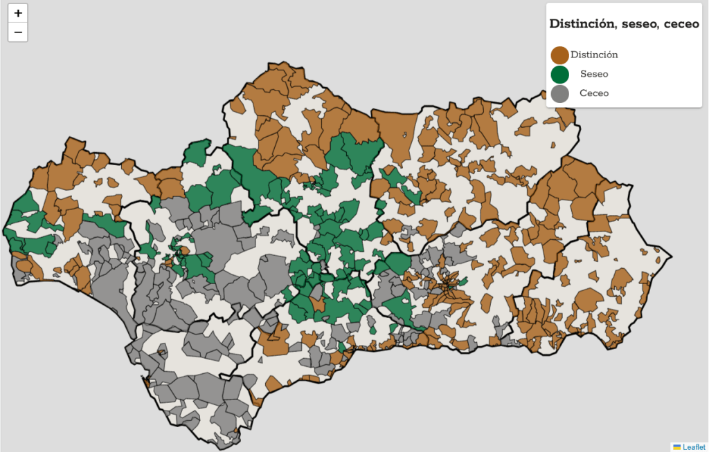 El mapa de arriba explica la distribución de la distinción /s/ – /θ/ («s» – «z»), seseo, y ceceo en Andalucía en 562 puntos. El listado abajo inluye los puntos estudiados y si predomina la distinción, seseo, o ceceo en cada uno de ellos. Los atlas lingüísticos son proyectos muy complejos y es normal que haya errores. Si crees que hay algún error en alguno de los códigos postales estudiados, lo puedes comonicar rellenando este cuestionario anónimo. Pincha AQUÍ.